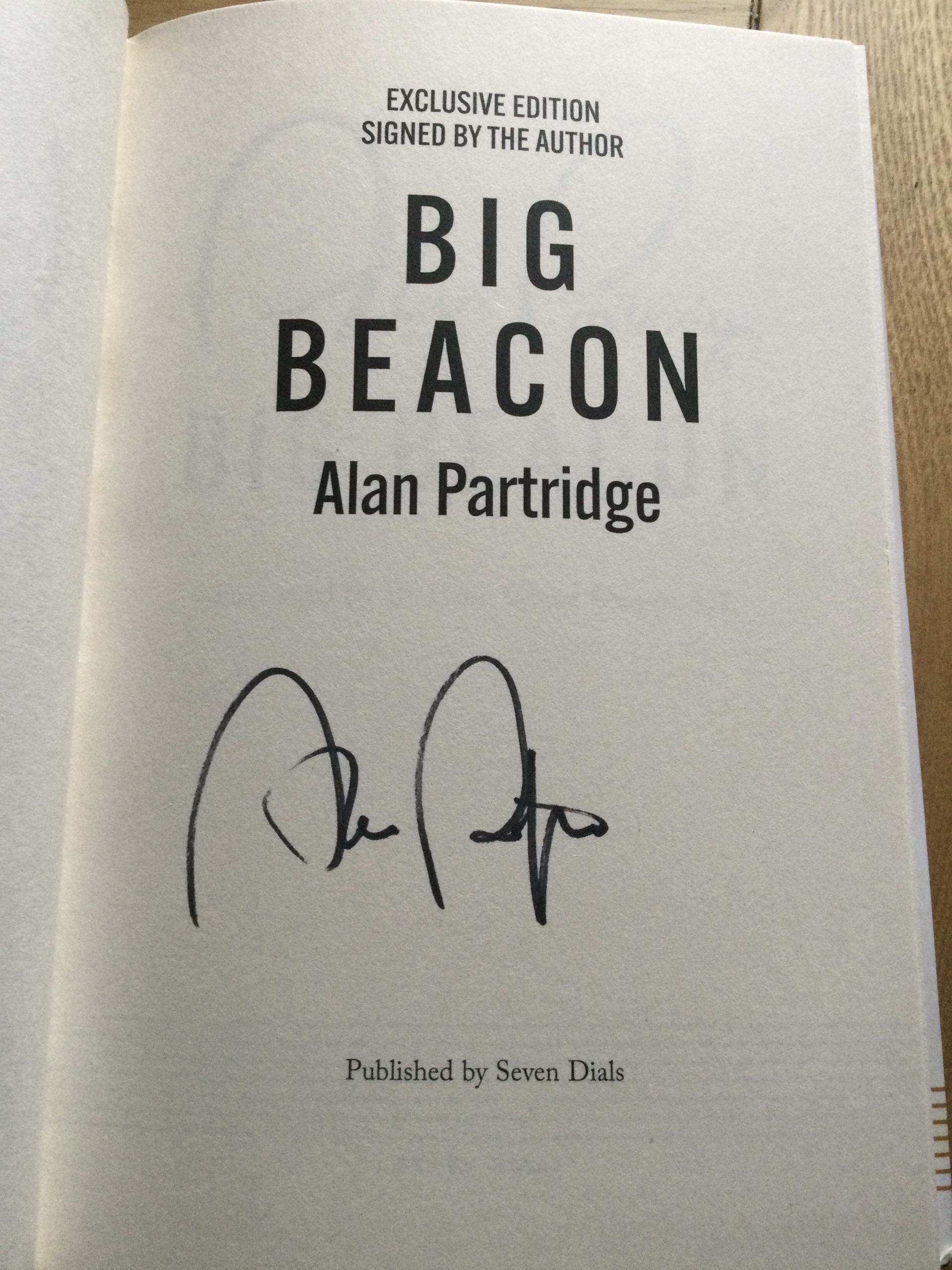 On offer a hardcover “Big Beacon” by Alan Partridge, signed to the title page by the author Alan Partridge