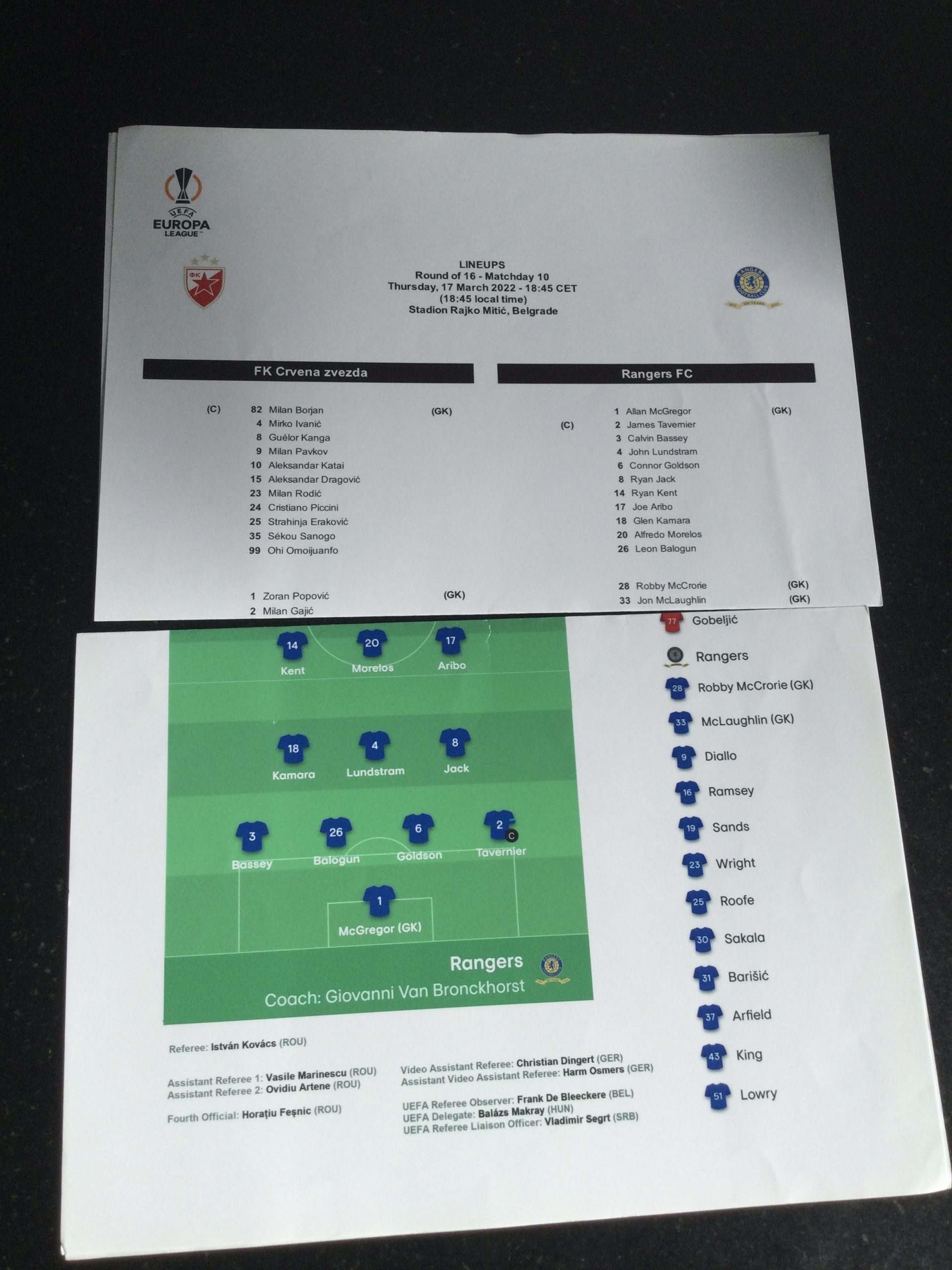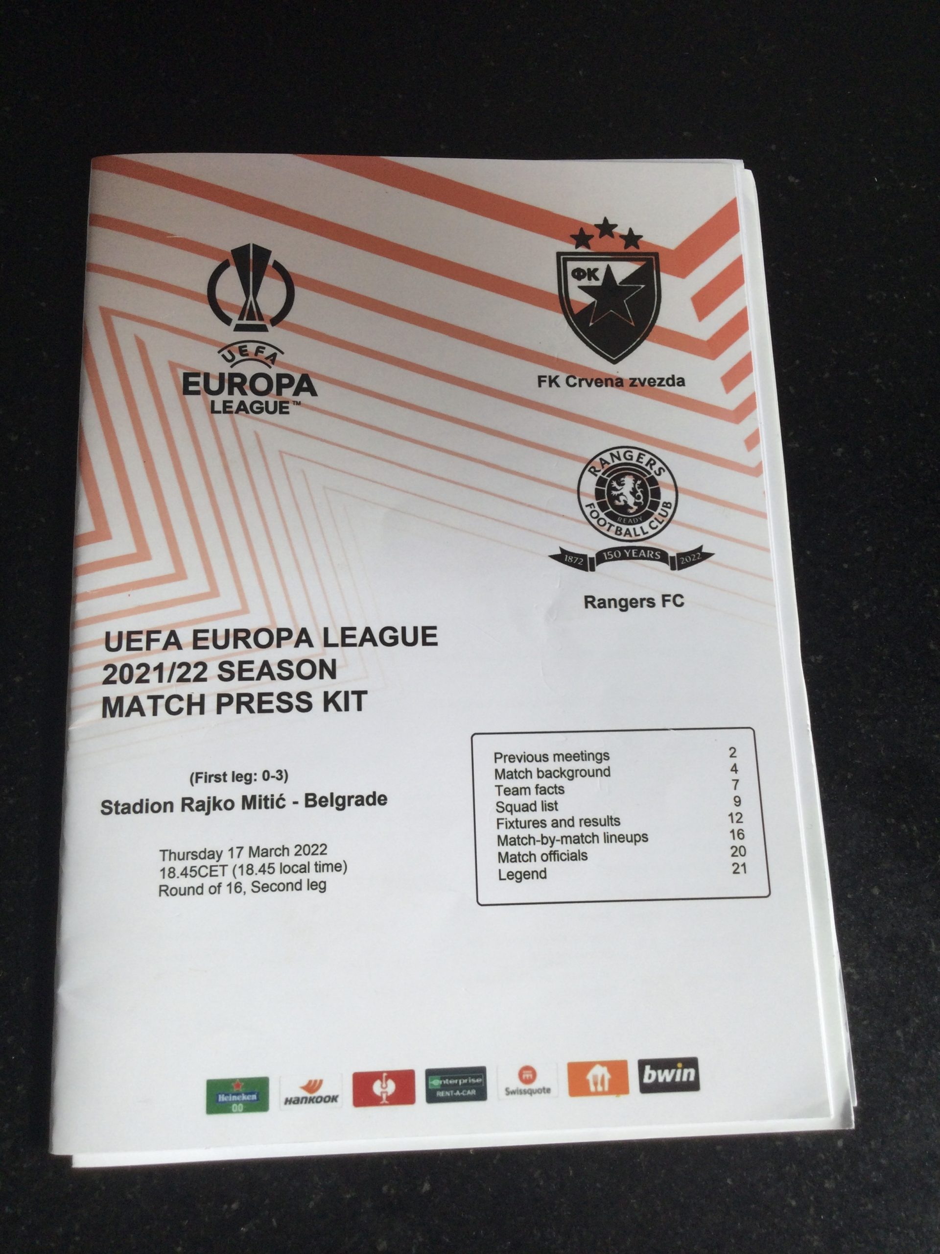 FK Crvena Zvezda v Rangers Europa League (Press Copy) Matchday Programme 2022