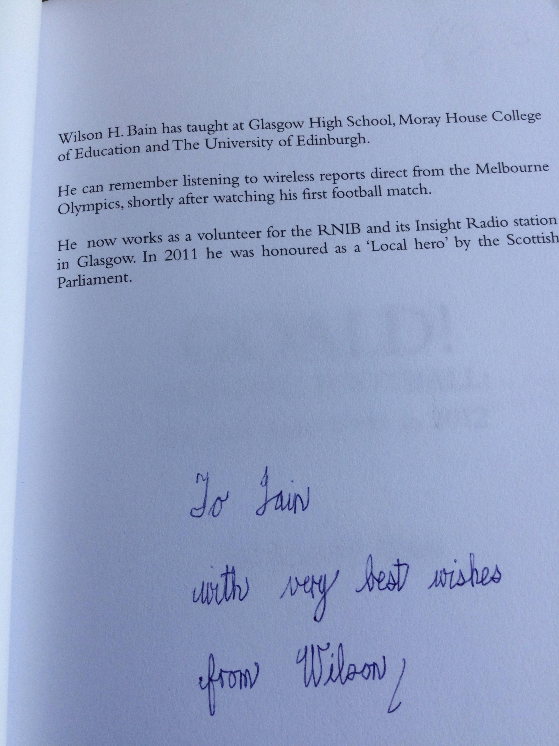 On offer a softcover “GOALD Olympic Football The Road From 1900 to 2012” by Wilson H. Bain, inscribed on the title page by the author Wilson H. Bain