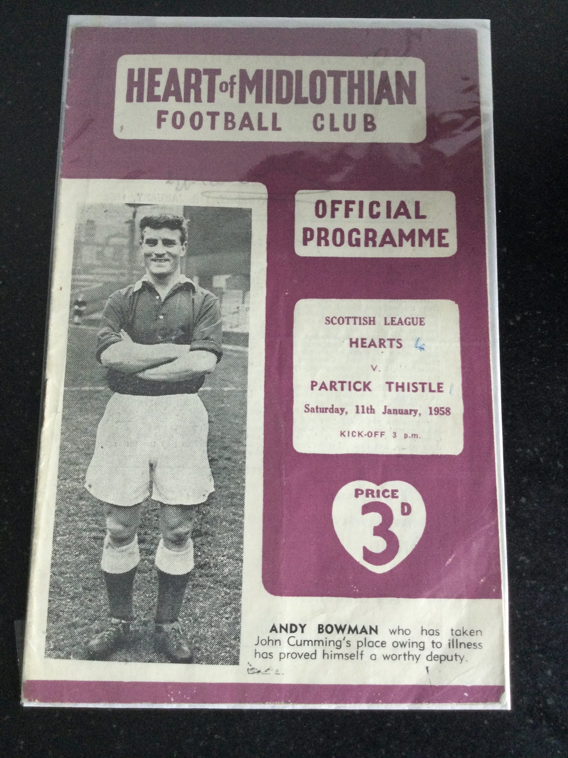 On offer an original matchday programme Heart of Midlothian v Partick Thistle 11 JAN 1958