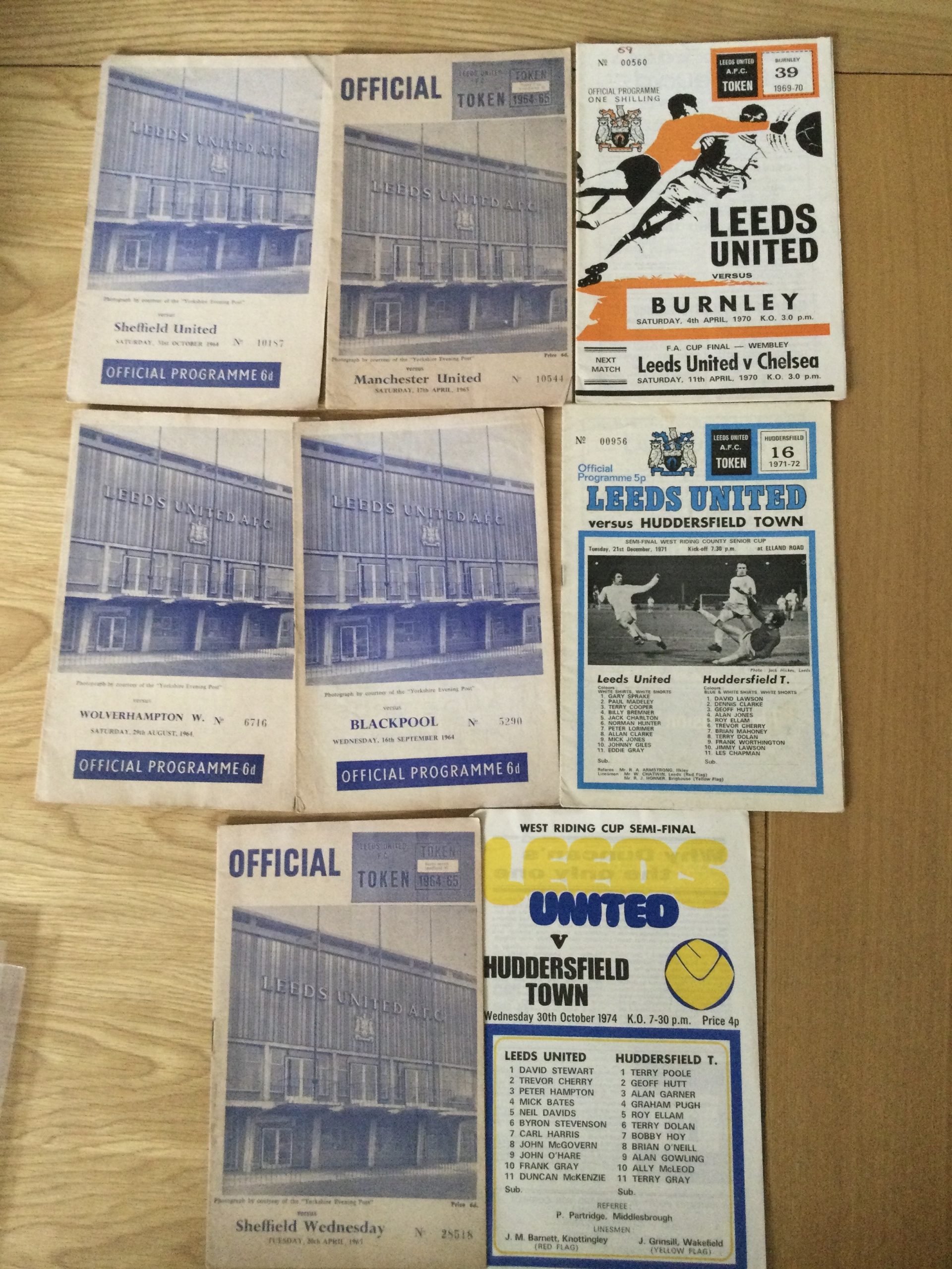 On offer original matchday programmes, Leeds United v Wolverhampton Wanderers 29 AUG 1964, Blackpool 16 SEP 21964, Sheffield United 31 OCT 1964, Manchester United 17 APR 1965, Sheffield Wednesday 20 APR 1965,Burnley 04 APR 1970, Huddersfield Town 21 DEC 1971 & 30 OCT 1974
